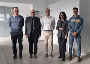 The photo shows (from left to right) Jan-Hendrik de Wiljes (postdoc committee member), Ralf Borndörfer (promoter and committee head), Felix Prause, Natalia Kliewer (committee member), and Nicolas Perkowski (committee member).